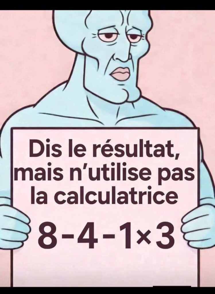 Tu penses être fort en calcul mental ? Alors attention… ce petit test piège presque tout le monde. À première vue, cette opération semble très simple.Rien de compliqué, juste quelques chiffres :  8 – 4 – 1 × 3 Beaucoup de personnes regardent ça…et donnent une réponse en quelques secondes. Sans réfléchir.Sans vérifier.Juste parce que … Read more