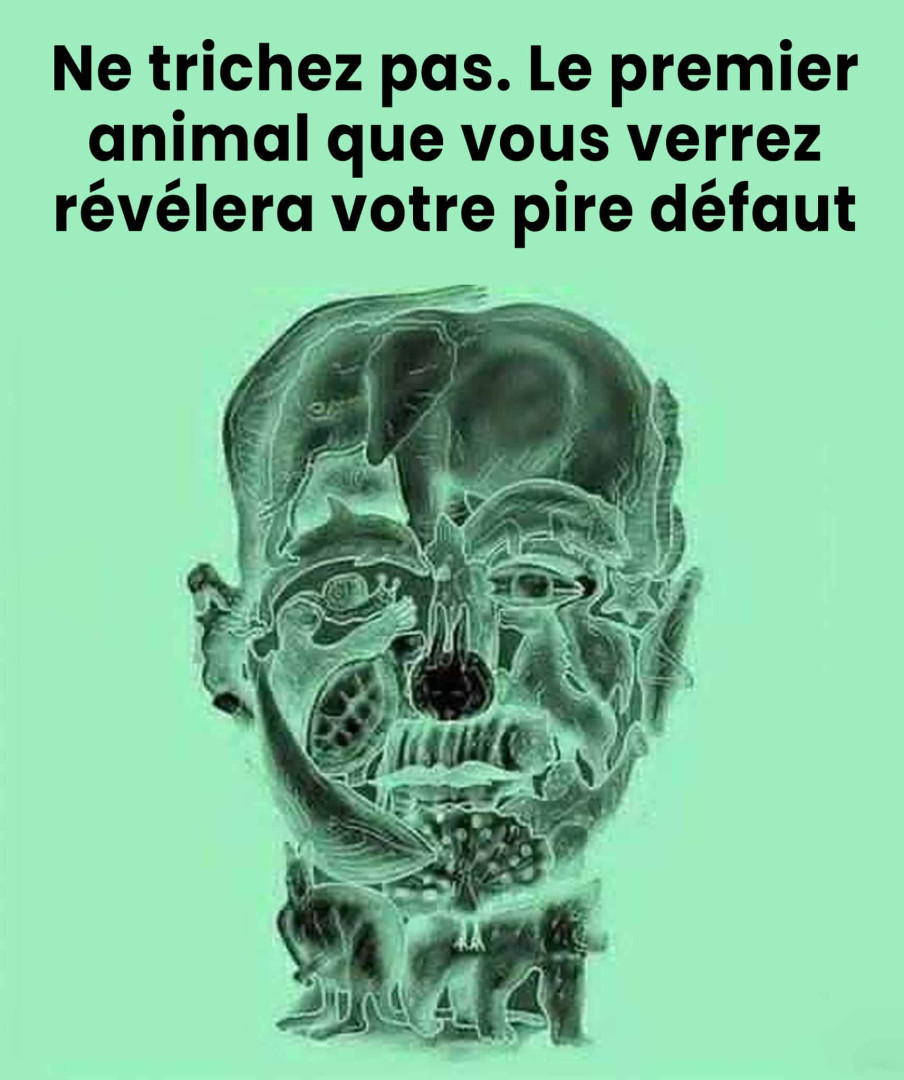 L’image représente un visage humain dans lequel sont dissimulés plusieurs animaux. Le principe est le suivant : la créature qui habille votre œil en premier serait liée à un trait de votre personnalité, parfois perçu comme un point faible. L’important est de vous fier à votre toute première impression, celle qui arrive avant même que votre cerveau n’ait le temps de tout analyser.